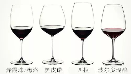 不同的红葡萄酒间也存在差异,因此针对不同特点,红葡萄酒杯又进一步细分为两类酒杯,分别是波尔多(Bordeaux)杯与勃艮第(Burgundy)杯。波尔多混酿主要以赤霞珠(Cabernet Sauvignon)和梅洛(Merlot)等红葡萄品种为主酿造而成,酒体相对饱满,风格宏大,香气比较奔放,需要波尔多杯来使酒香充分散发,同时能聚集大部分香气。勃艮第红葡萄酒以黑皮诺(Pinot Noir)为主,这一品种酿造的红葡萄酒香气优雅,酒体轻盈至适中,没有波尔多混酿那么浓郁,因此需要杯口较大且杯浅的勃艮第杯来散发其香气。此外,一些著名的酒杯生产商还根据不同品种葡萄酒的特点进一步设计了赤霞珠杯、黑皮诺杯、西拉(Syrah)杯和梅洛(Merlot)杯等杯具。